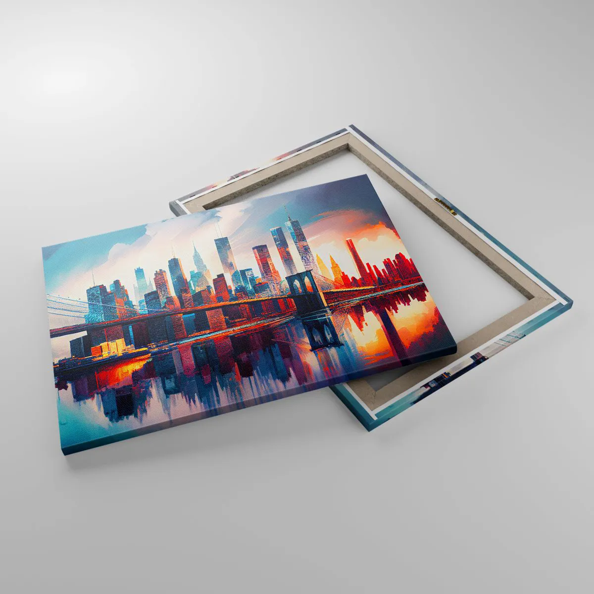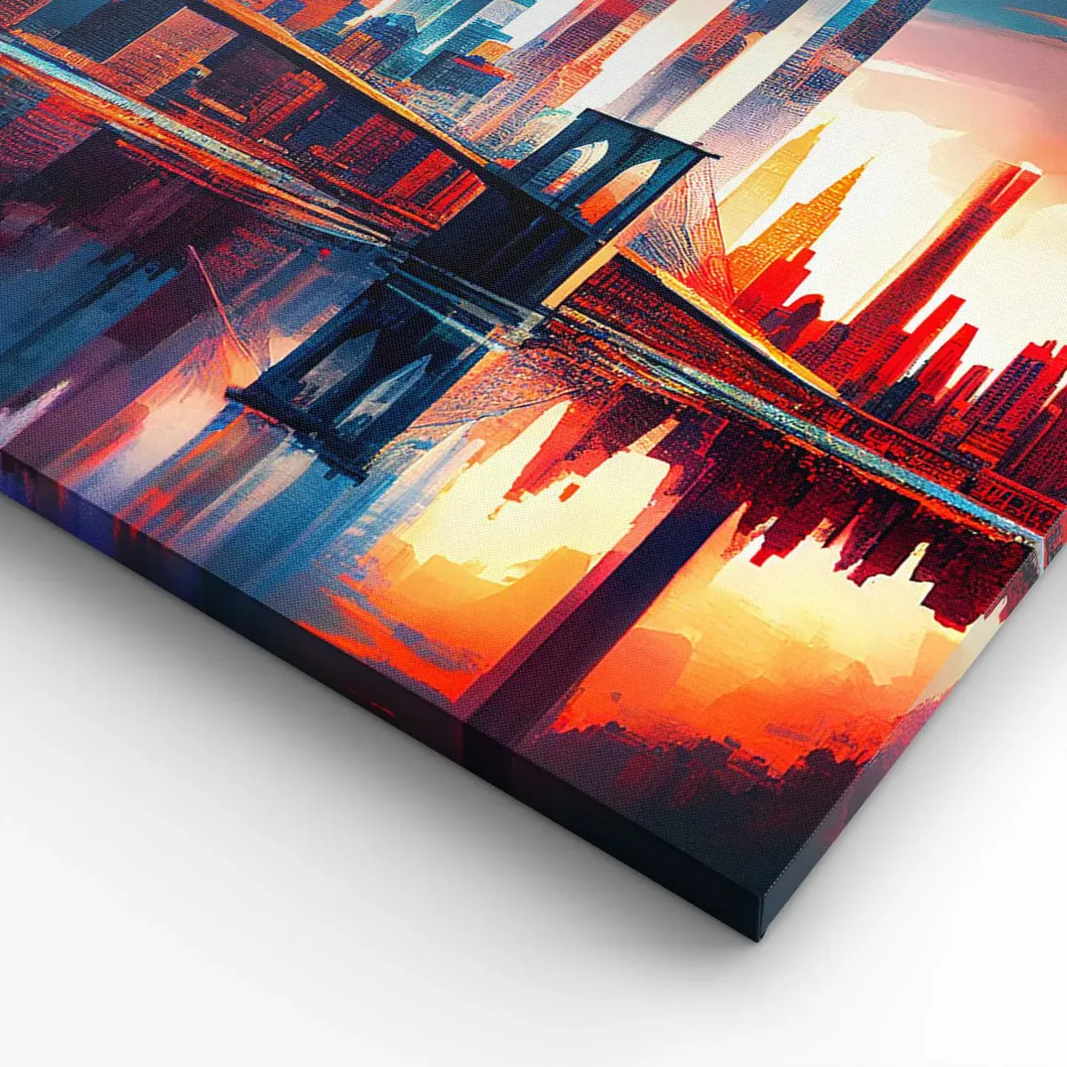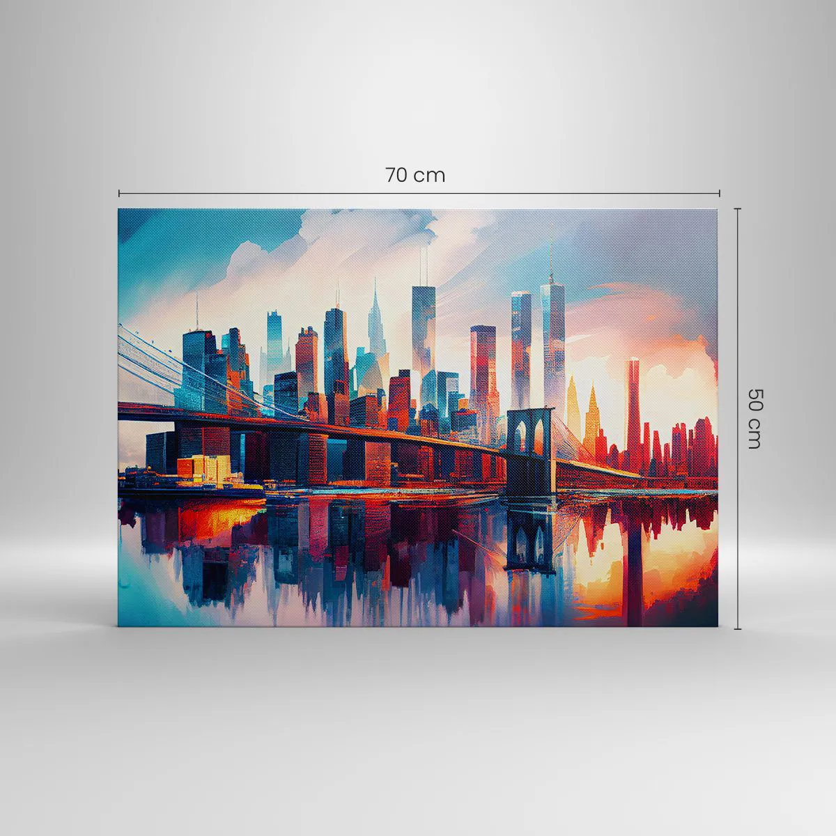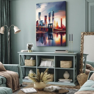 - Plátno s vyobrazením panorámy New Yorku s mostom a odrazom vo vode. Dokonalý doplnok do moderného interiéru, ktorý zdôrazňuje mestský štýl.