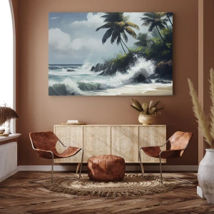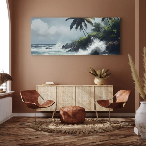 - Maľba na plátne zobrazujúca tropické pobrežie s palmami a rozbúreným morom, vnášajúca do interiéru exotickú atmosféru a dynamiku prírody.