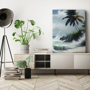 „Na tropickom pobreží“ je plátno s rozmermi 70x50 cm, ktoré nás prenesie na malebnú pláž obklopenú tropickými palmami a rozbúreným morom. Dynamické vlny obklopujúce pobrežie a bujná zeleň vytvárajú harmonickú kompozíciu, ktorá zachytáva krásu a silu prírody. Táto tlač vnáša do interiéru teplú, exotickú atmosféru, ideálnu do priestorov inšpirovaných dovolenkou a relaxáciou.