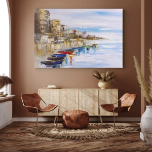 Motív obrazu spája energiu mesta a pokoj vody, čím prináša do interiérov harmóniu a rovnováhu. Odrazy na vodnej hladine a viacfarebné lode vytvárajú dynamickú a inšpiratívnu kompozíciu, ktorá priťahuje oko a podnecuje fantáziu.