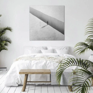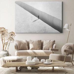 - Tento obraz zobrazuje osamelú postavu stojacu nad priepasťou v monochromatickom prostredí. Minimalistická a reflexívna kompozícia dodáva interiérom emotívny nádych a eleganciu. Je to perfektná voľba pre milovníkov súčasného umenia.
