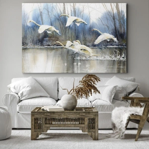 - Tento obraz zobrazuje labute letiace nad zamrznutým jazerom v zimnej krajine. Táto jemná a atmosférická kompozícia prináša harmóniu a pokoj do každého interiéru. Je to perfektná dekorácia pre milovníkov prírody a zimnej krajiny.