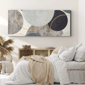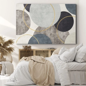 Jemné línie kruhov a vyvážené proporcie vytvárajú obraz plný harmónie. Sivá a modrá prinášajú pokoj, zatiaľ čo zlaté akcenty dodávajú kompozícii teplo a luxusný charakter. Textúra obrazu zdôrazňuje jeho jedinečný štýl, vďaka čomu sa stane dokonalým ústredným bodom v každom priestore.