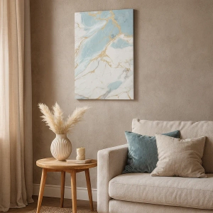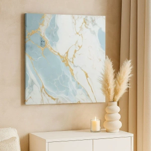 - Štýlový obraz s modrým a bielym mramorovým vzorom doplneným jemnými zlatými žilami. Ideálna voľba do moderného aj klasického interiéru, dodá eleganciu a luxus každému priestoru.