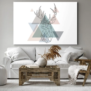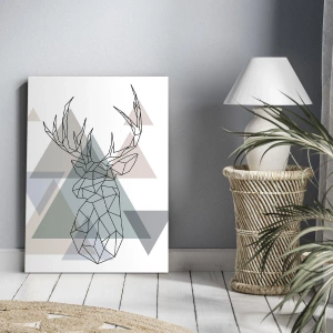 • Obraz zobrazuje geometrického jeleňa na pozadí pastelových trojuholníkov, čím vytvára minimalistickú a modernú kompozíciu ideálnu pre súčasné interiéry.