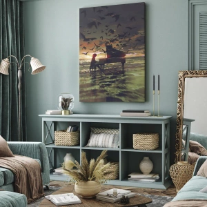 - Tento obraz zobrazuje osamelý klavír na brehu mora pri západe slnka, obklopený lietajúcimi vtákmi, čím vytvára magické a inšpiratívne prostredie. Ideálne pre milovníkov umenia a hudby.