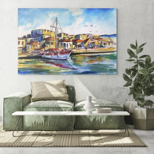 Architektúra v pozadí je harmonickým spojením malých domov so škridlovými strechami, obranných múrov a prímorskej krajiny, ktorá v kombinácii s plachetnicou vytvára pokojný a dynamický obraz prístavného mesta. Kompozícia zachytáva ducha stredomorských letovísk a vytvára atmosféru teplého popoludnia. Je ideálna pre interiérové dizajny, ktoré majú evokovať spomienky na dovolenku a relax.