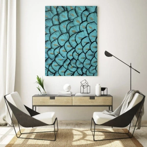 Obraz „Veľká gala pierok“ je fascinujúci detailný záber štruktúry pávích pierok, ktoré vytvárajú fascinujúci dekoratívny vzor v odtieňoch tyrkysovej, modrej a jemných zlatých odleskov. Každé pierko je nakreslené s mimoriadnou presnosťou a usporiada sa do harmonickej, opakujúcej sa kompozície inšpirovanej prírodou. Opakovateľnosť vzoru pripomína luxusné látky, tapety alebo šperky, čo dodáva obrazu bohatý, no zároveň nenápadný výraz. Tento motív kombinuje prirodzenosť s grafickou pravidelnosťou, vďaka čomu je dielo jemné aj expresívne.