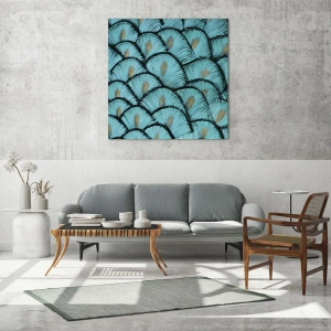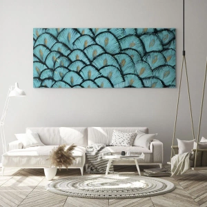 - Detailný záber na tyrkysové pávie perá usporiadané v opakujúcom sa vzore. Obrázok vyžaruje eleganciu a exotiku a vnáša do interiéru zmyselný nádych prírody.