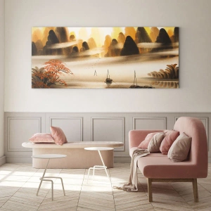Obraz na skle - Orientálna krajina s loďkami a horami v hmle - 70x50cm - Ďalej ako na Ďalekom východe - Moderná nástenná dekorácia do obývacej izby a spálne ARTTOR