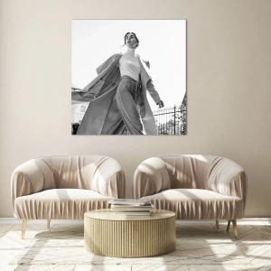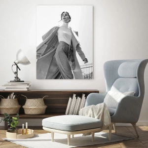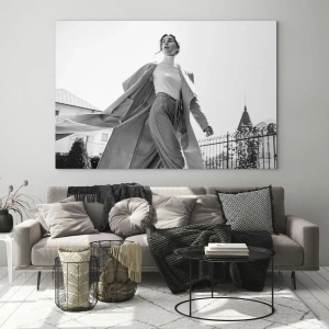 - Sklenený obraz zobrazujúci elegantnú ženu v pohybe na pozadí mestskej architektúry. Vyhotovený v čiernobielej farbe vytvára atmosféru fotenia v pouličnom štýle.