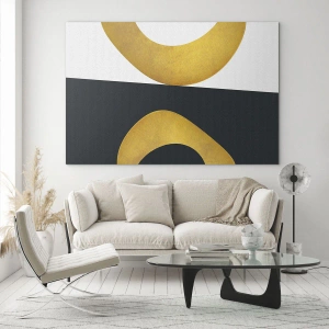 - Moderná grafika s geometrickými tvarmi v odtieňoch zlatej na čiernobielom pozadí. Táto minimalistická a štýlová kompozícia dokonale zdôrazňuje eleganciu a moderný charakter interiéru.
