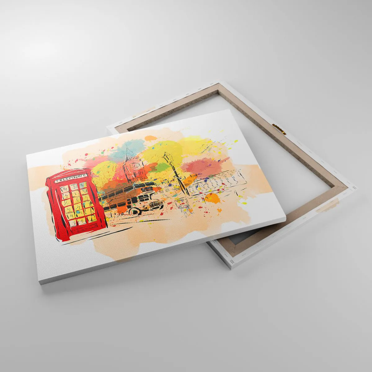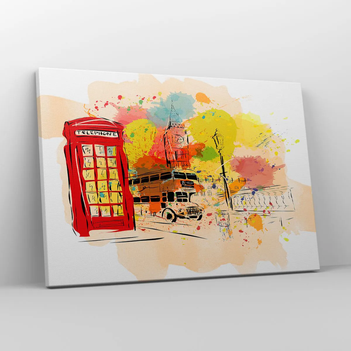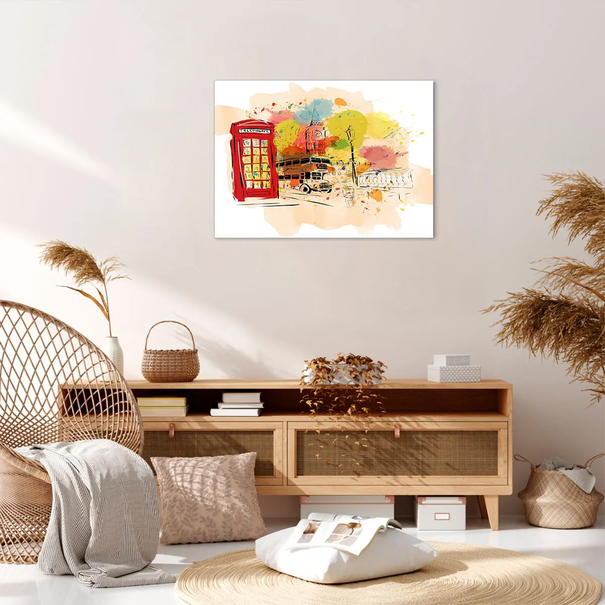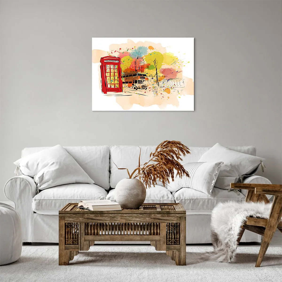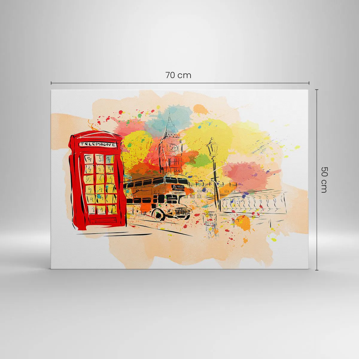 • Tento žiarivý obraz zobrazuje londýnske ikony ako červený autobus, telefónnu búdku a Big Ben na farebnom akvarelovom pozadí. Dokonalá dekorácia pre milovníkov mestského štýlu a anglického vkusu.