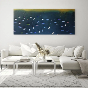 Scéna je plná detailov – každá loď pôsobí inak a vytvára dynamický, no zároveň harmonický celok. Roztrúsené ako dieliky puzzle na modrom pozadí, lode v rôznych farbách – červenej, modrej, zelenej a bielej – vytvárajú maliarsky efekt. Pohľad z vtáčej perspektívy dodáva originalitu a priťahuje pohľad. Zlatý piesok a intenzívny kontrast modrej vody vytvárajú podmanivú krajinu, ktorá do interiéru vnáša nádych exotiky.