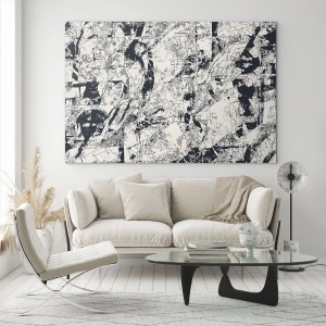 - Abstraktná kompozícia v kontrastných odtieňoch čiernej a bielej. Komplexné štruktúry a dynamické línie vytvárajú expresívny dizajn, ktorý sa dokonale hodí do moderných, industriálnych interiérov.