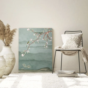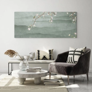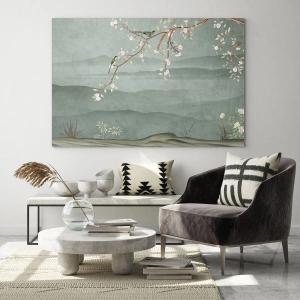 - Dekoratívna tlač s kvitnúcou vetvičkou a vtákmi na pozadí zelených kopcov. Maľba sa vyznačuje jemnosťou, romantizmom a prirodzenou harmóniou, ideálna do interiérov inšpirovaných orientálnym a klasickým štýlom.