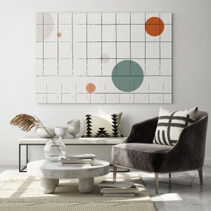 - Grafická kompozícia s tenkou geometrickou mriežkou a farebnými kruhmi v odtieňoch zelenej, oranžovej a béžovej. Moderný a minimalistický štýl sa hodí ako dekorácia v kancelárskych a domácich priestoroch.