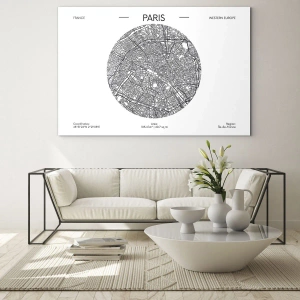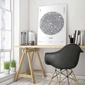 - Čiernobiela ilustrácia s mapou Paríža v kruhovej kompozícii. Jej minimalistický štýl a čisté línie dodávajú moderný nádych. Elegantná interiérová dekorácia s nádychom mestskej inšpirácie.