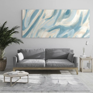 • Dynamická abstraktná kompozícia zložená z modrých a krémových ťahov štetcom, maľba vyžaruje ľahkosť a pokoj a vytvára harmonickú dekoráciu ideálnu pre svetlé, moderné interiéry.