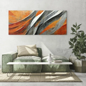 - Obraz predstavuje dynamickú kompozíciu abstraktných pruhov v kontrastných oranžovej, sivej a bielej farbe. Táto kompozícia plná energie a pohybu je ideálna do modernej obývačky alebo kancelárie.