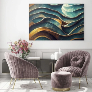 Moderná dekorácia, v ktorej vlny, modrá a meandre vytvárajú ucelenú priestorovú víziu. Tento obraz obohacuje interiér a dodáva mu jedinečnú atmosféru.