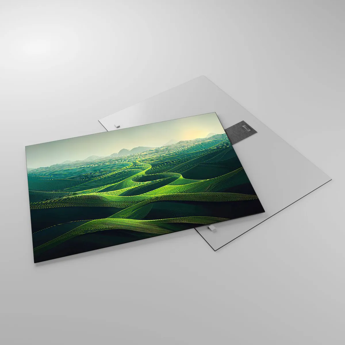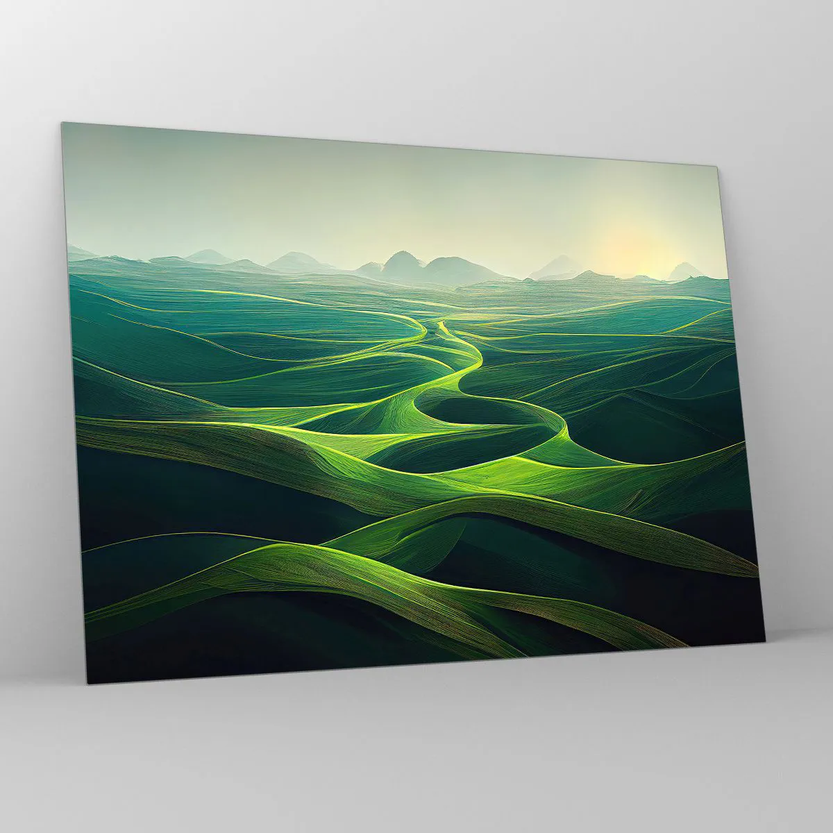 Obraz na skle - Zelené kopce a údolia osvetlené slnečnými lúčmi - 70x50cm - V zelených údoliach - Moderná nástenná dekorácia do obývacej izby a spálne ARTTOR
