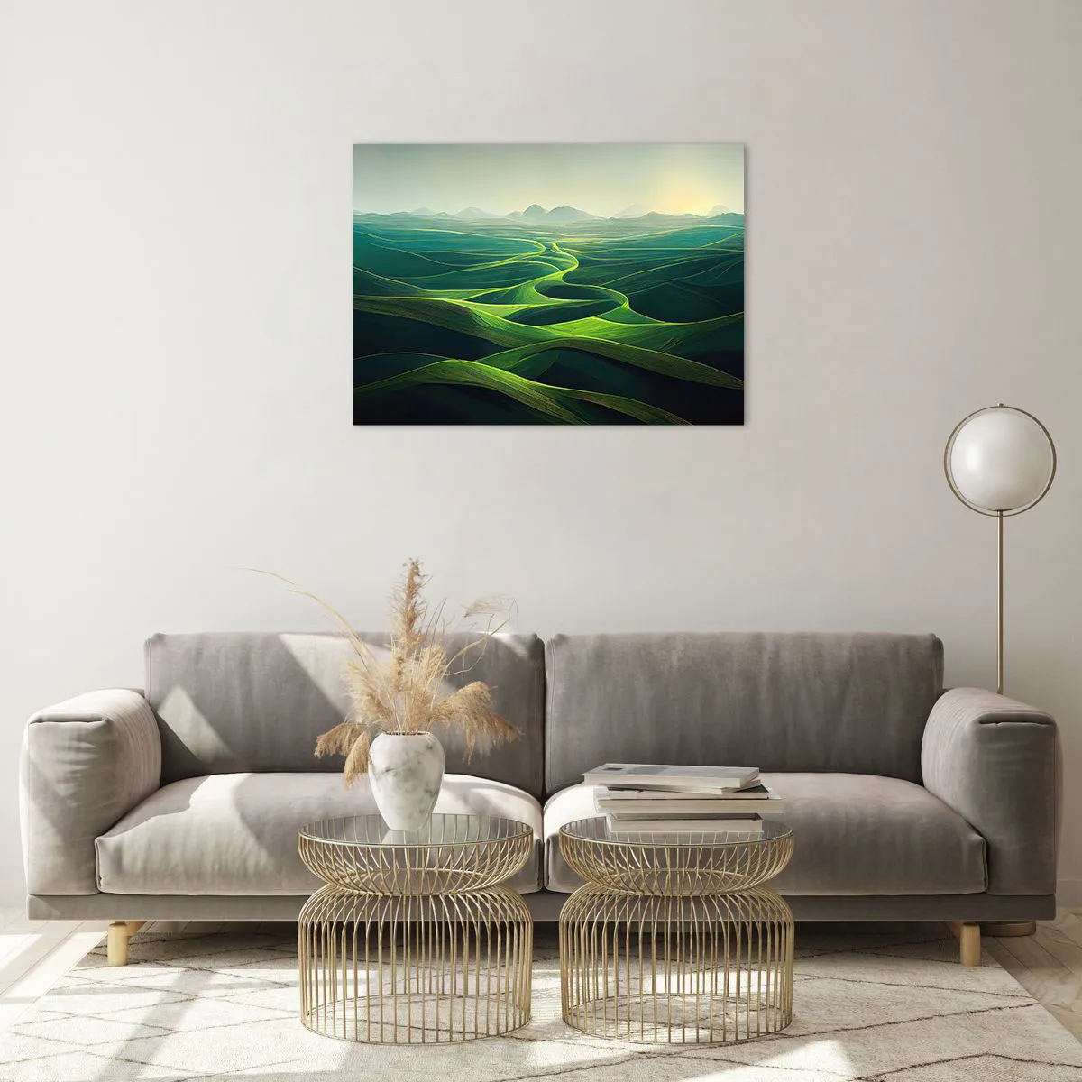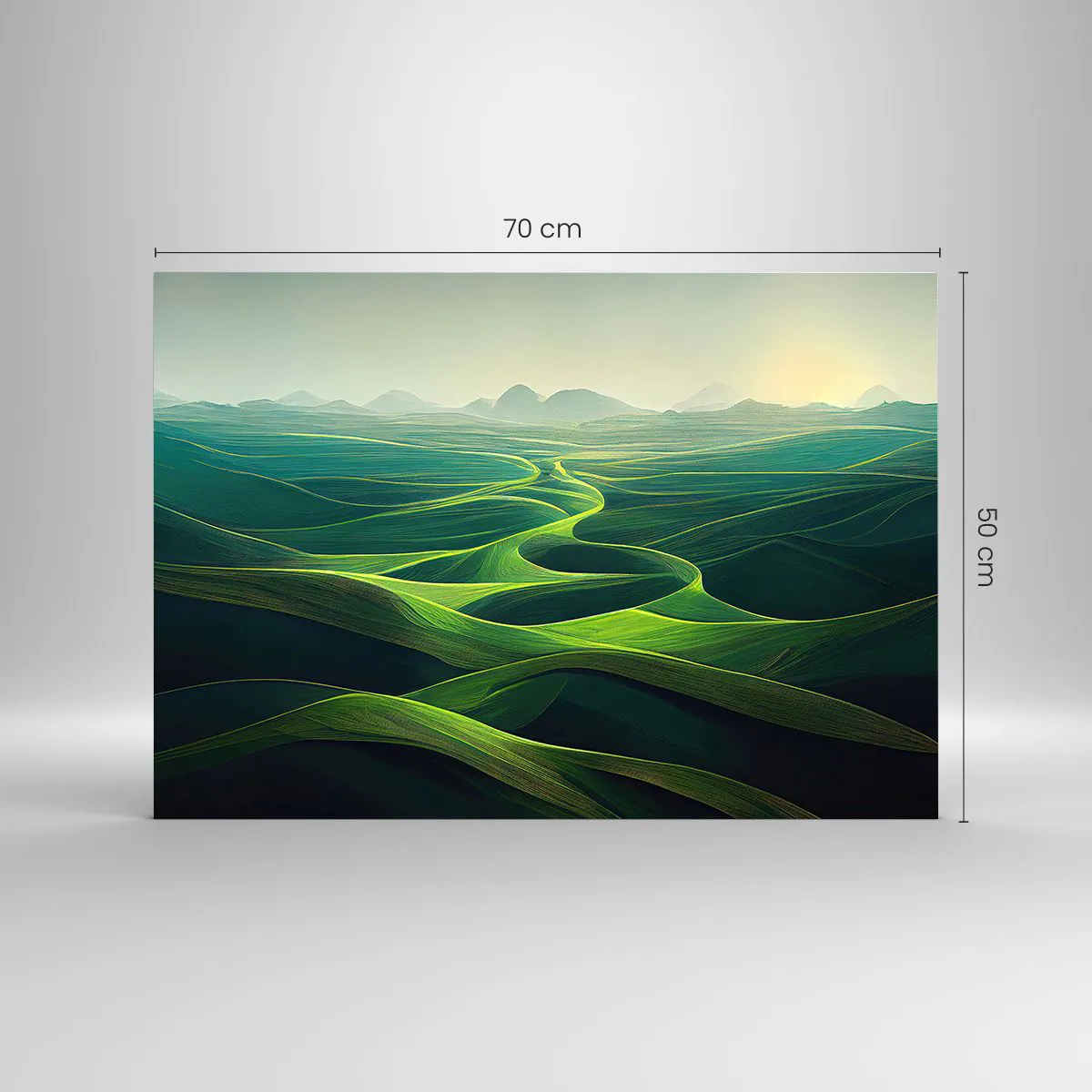 Dekorácia do obývačky, kde zeleň, svetlo a údolia vytvárajú príbeh o kráse prírody a tichu priestoru. Tento obraz je vynikajúcou voľbou pre tých, ktorí hľadajú pokoj a vizuálnu harmóniu.