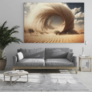 Pozadie je vyplnené jemnými oblakmi a modrobéžovou oblohou, ktoré kontrastujú s intenzívnym pohybom pieskového víru. Celá kompozícia vyžaruje pokoj a zároveň evokuje napätie, pričom púta pozornosť svojou mimoriadnou dynamikou. Tento motív sa dokonale hodí do priestorov, ktoré vyžadujú jedinečnú a inšpiratívnu dekoráciu.