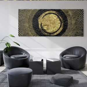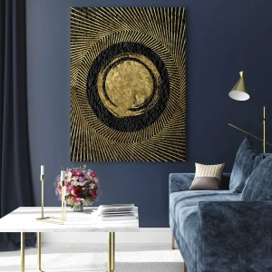 • Obraz zobrazuje zlatý kruh obklopený geometrickými lúčmi na čiernom pozadí. Očarujúci štýl a kontrastná forma dodávajú kompozícii luxusný a moderný nádych.