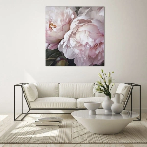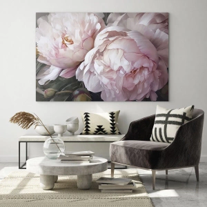 - Detailný záber na jemné, svetloružové pivonky v plnom kvete. Jemná farebná schéma a jemné prechody zdôrazňujú romantickú povahu tejto kompozície, ideálnej pre interiéry s nádychom elegancie.