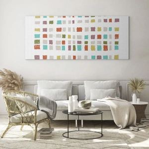 - Abstraktná kompozícia zložená z viacfarebných štvorcov vytvárajúcich rytmickú mozaiku na bielom pozadí. Ľahká a kreatívna dekorácia do moderných a minimalistických interiérov.