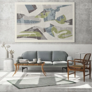 • Abstraktná kompozícia zložená z geometrických tvarov v odtieňoch zelenej, modrej a sivej. Moderný a štýlový motív ideálny do obývačky, spálne alebo kancelárie.