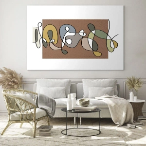 Motív čiary, ktorý prechádza prvkami obrazu, symbolizuje spojenia a interakcie – môže to byť cesta myšlienok, dialóg alebo záznam okamihu. Hnedé pozadie dodáva celku teplo a hĺbku a kontrastná kombinácia s jasnými farbami dodáva grafike priestrannosť a dynamiku. Táto estetika sa perfektne hodí k modernému, škandinávskemu a minimalistickému štýlu.