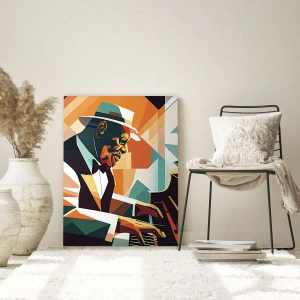 - Energická kompozícia zobrazujúca jazzového klaviristu za klavírom. Farebný štýl inšpirovaný geometriou a rytmom hudby.