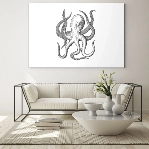 - Obraz obsahuje precíznu čiernobielu kresbu chobotnice vo vintage štýle na bielom pozadí. Je ideálny do moderných, námorníckych a minimalistických interiérov, kladie dôraz na detail a eleganciu.