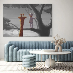 - Obraz zobrazuje dieťa v pyžame a žirafu, ktoré stoja spolu na strome a sledujú západ slnka. Teplá, rozprávková scéna, ideálna do detskej izby, vytvára atmosféru spánku a snov.