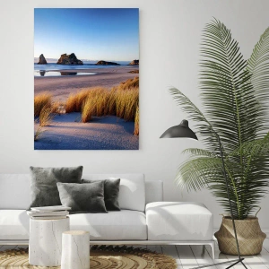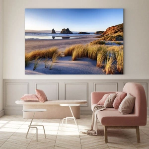 - Obraz zobrazuje pokojnú plážovú krajinu za úsvitu s pieskom, trávou a skalami v pozadí. Prírodná kompozícia v teplých farbách, ideálna pre relaxačné a priestranné interiéry.