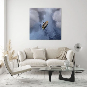 • Obraz zobrazuje muža plaviaceho sa na lodi po vode obklopenej oblakmi, čím vytvára atmosféru cesty a zamyslenia. Ideálny do moderných, minimalistických interiérov a kontemplatívnych priestorov.