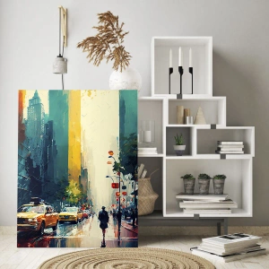 Obraz „New York - Aj dážď je tu farebný“ je energickou víziou života vo veľkomeste. Zachytená scéna zobrazuje preplnenú mestskú ulicu s charakteristickými žltými taxíkmi jazdiacimi po mokrom asfalte. Mrakodrapy a budovy v pozadí vytvárajú kulisu plnú hĺbky a farebného kontrastu, ktorú zvýrazňujú svetelné odrazy na povrchu. Kompozícia priťahuje pohľad svojou intenzitou a pulzom modernej metropoly.