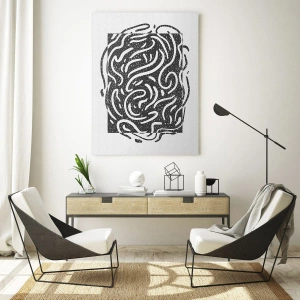 Obraz „Abstrakcia: Tanec radosti“ je kompozícia plná pohybu a pozitívnej energie. Zdanlivo chaotické, nepravidelné čiary a rozptýlené bodky tvoria expresívny tanec, ktorý priťahuje pozornosť a stimuluje predstavivosť. Čiernobiela forma prináša grafickú jasnosť a dynamiku, čím vytvára intenzívne, no zároveň súdržné dielo.