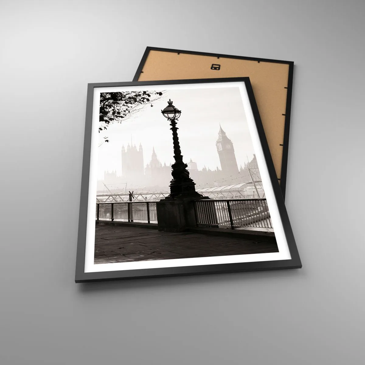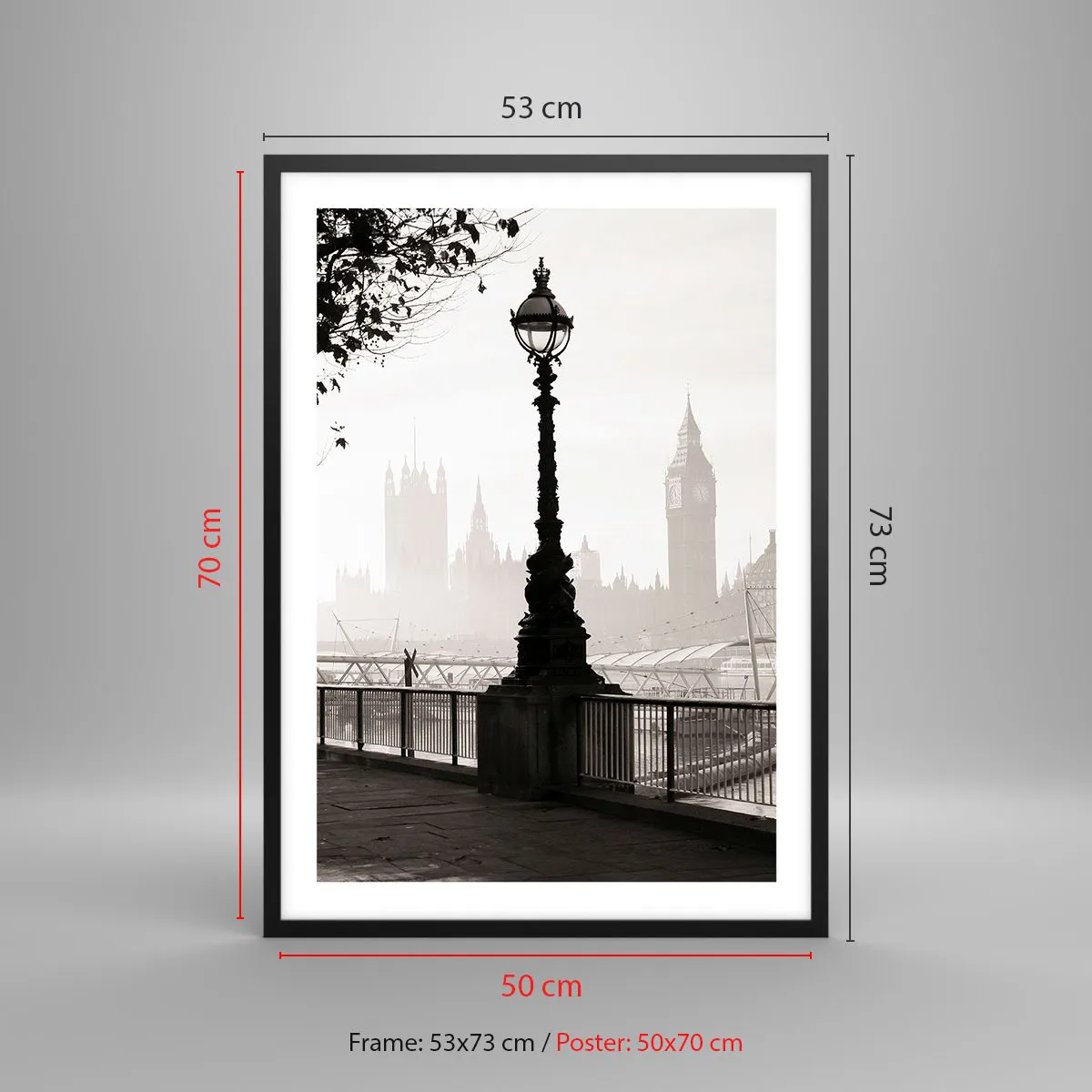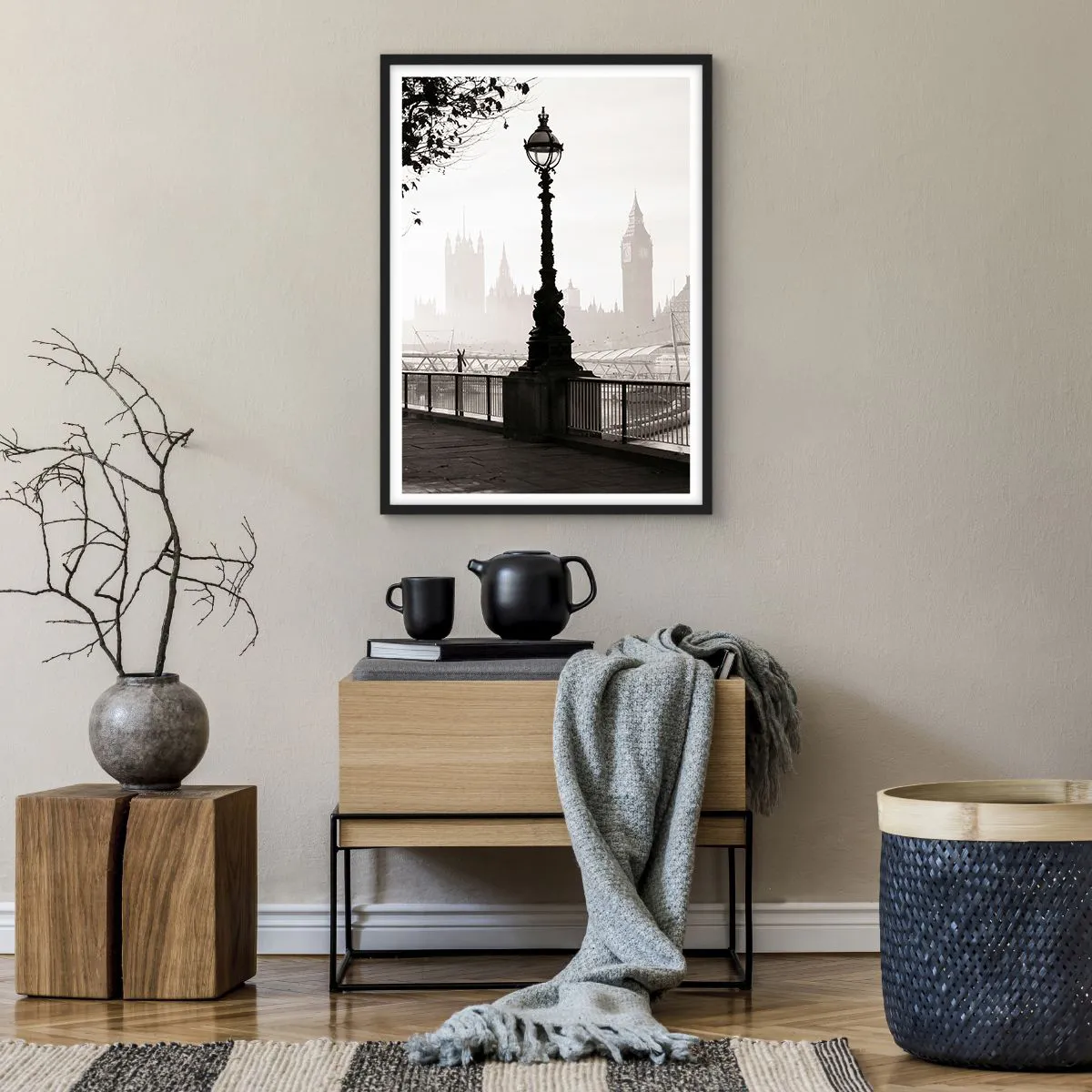 Plagát v čiernom ráme - Čiernobiela fotografia majáka na pozadí zahmlených mestských pamiatok. - 50x70cm - Londýnske ráno - Moderná nástenná dekorácia do obývacej izby a spálne ARTTOR