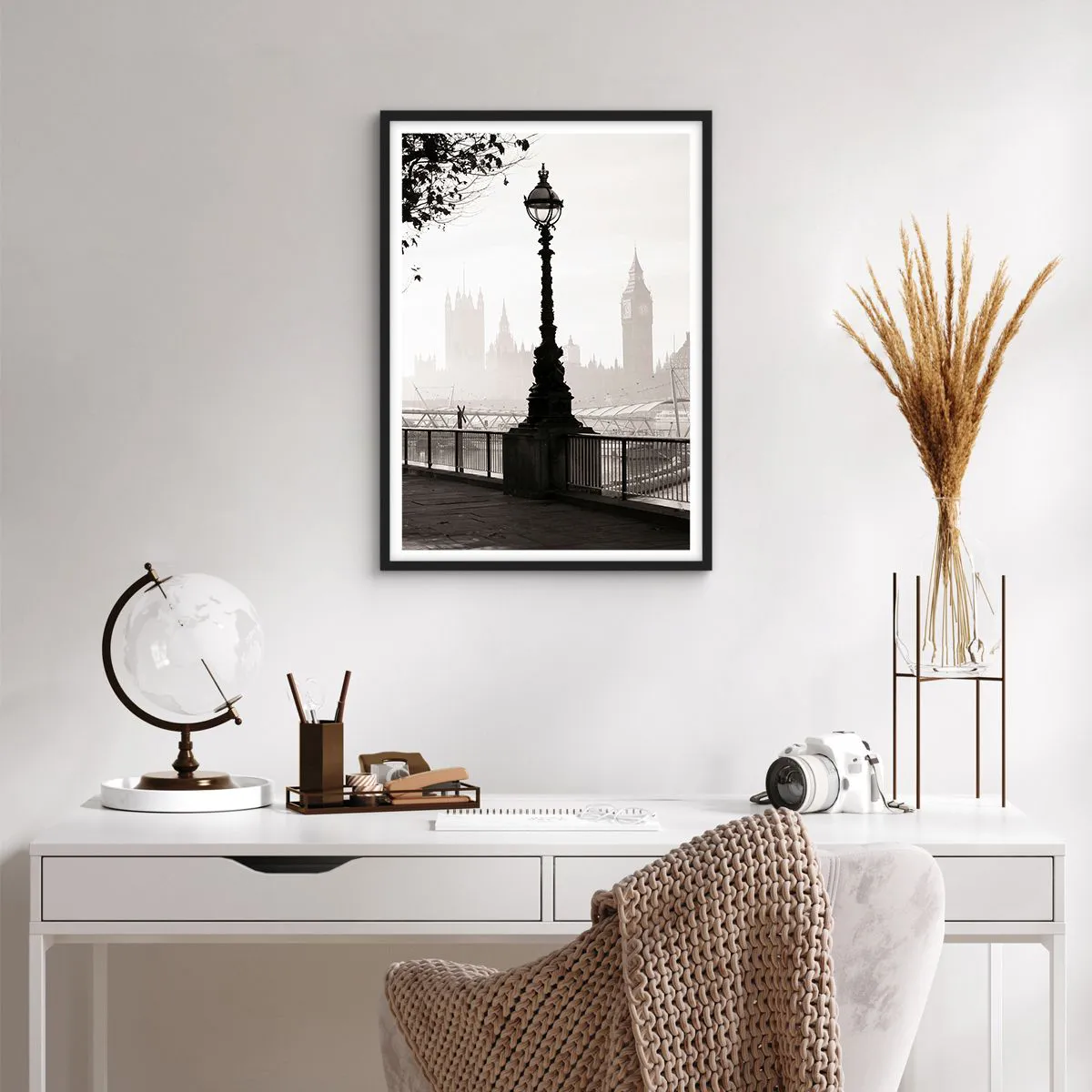 Plagát - Londýnske ráno - Čiernobiela fotografia pouličnej lampy na pozadí hmlistých mestských pamiatok