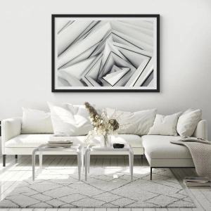 • Tento plagát zobrazuje trojrozmernú abstrakciu geometrických trojuholníkov. Ilúzia priestoru a presné línie vytvárajú modernú, minimalistickú kompozíciu ideálnu pre štýlové interiéry.