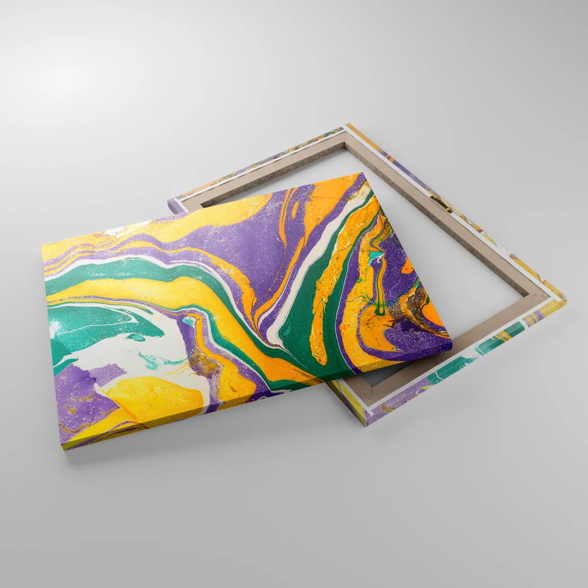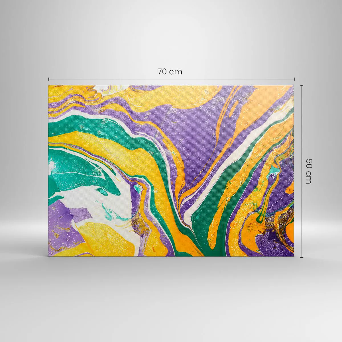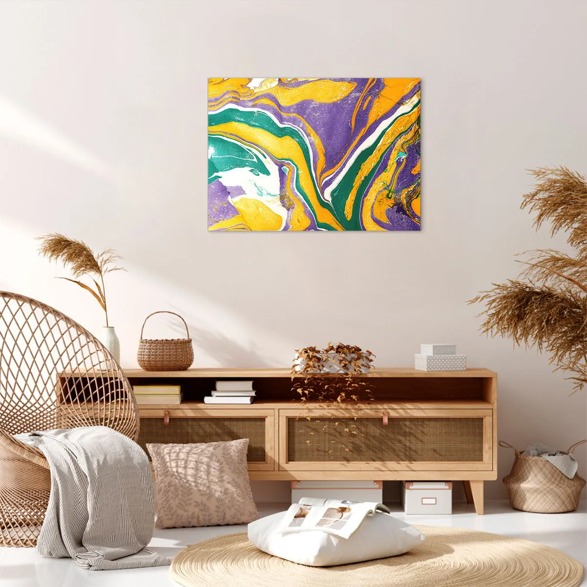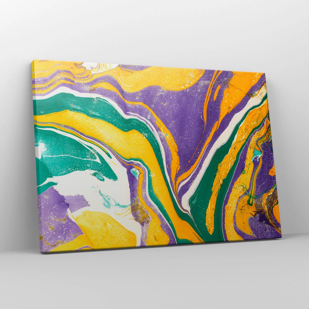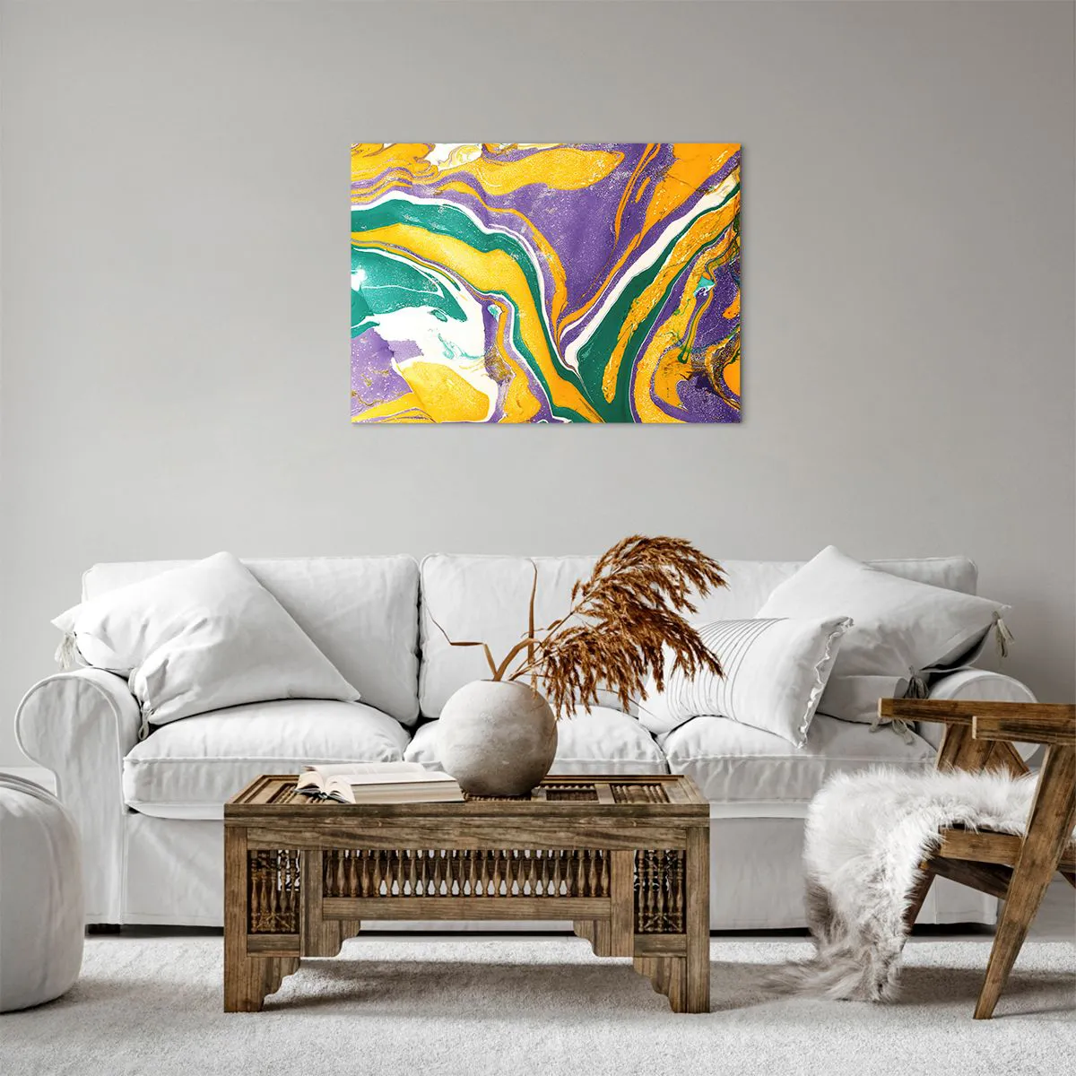 Vlny farieb je jedinečná tlač na plátno, ktorá zaujme svojou abstraktnou kompozíciou inšpirovanou mramorovým vzorom. Živé farby, ako je intenzívna žltá, tmavo fialová a svetlozelená, sa prelínajú a vytvárajú dynamický a zaujímavý celok. Mramorový vzor vnáša do interiéru nádych modernity, no zároveň eleganciu, ktorá púta pozornosť.