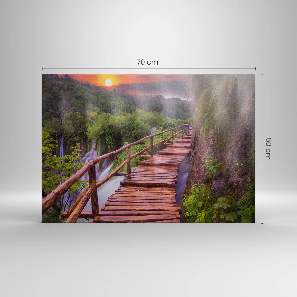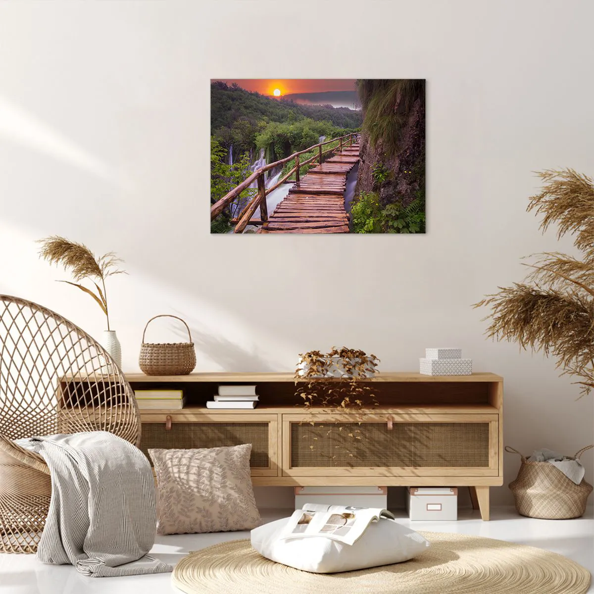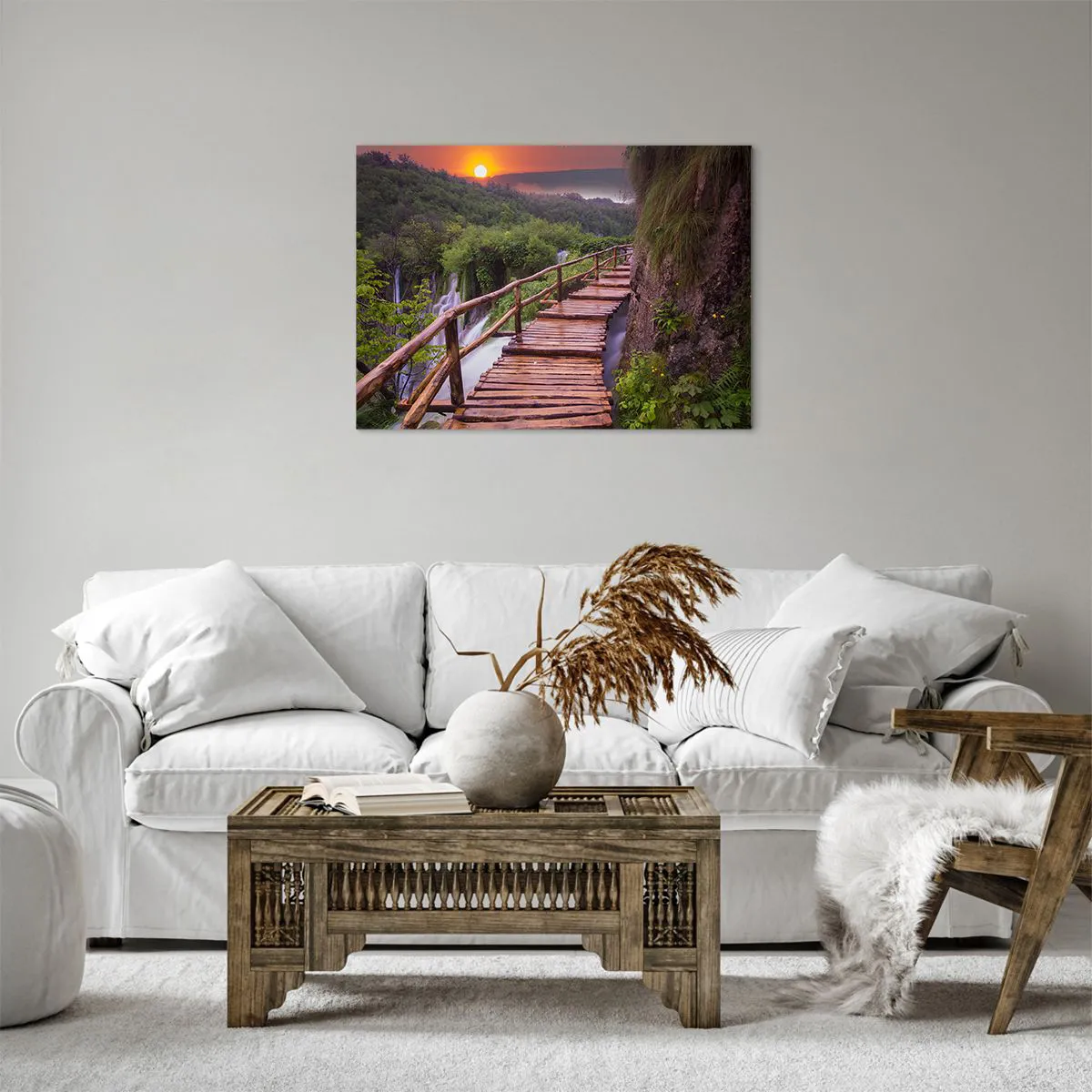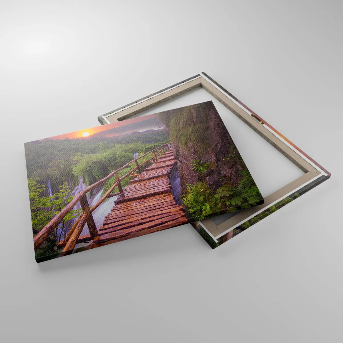„Krása nad vierou“ je úžasný obraz na plátne zobrazujúci drevený most obklopený bujnou vegetáciou a vodopádmi. Osvetlenie zapadajúceho slnka dodáva scenérii magické čaro a vytvára nádhernú atmosféru pokoja a relaxácie.