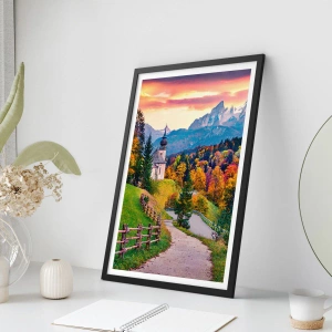 Plagát v čiernom ráme - Horská kaplnka medzi jesennými stromami pri západe slnka - 50x70cm - Úplne ideálna krajina - Moderná nástenná dekorácia do obývacej izby a spálne ARTTOR