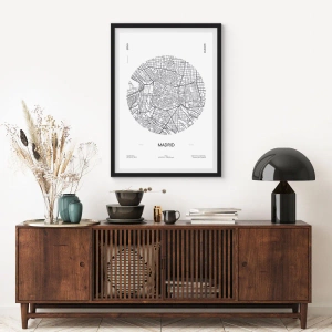 Plagát v čiernom ráme - Minimalistická mapa Madridu v čiernobielej farbe. - 50x70cm - Anatómia Madridu - Moderná nástenná dekorácia do obývacej izby a spálne ARTTOR