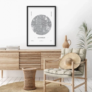 Plagát v čiernom ráme - Minimalistická mapa Los Angeles v čiernobielej farbe. - 50x70cm - Anatómia Los Angelesu - Moderná nástenná dekorácia do obývacej izby a spálne ARTTOR
