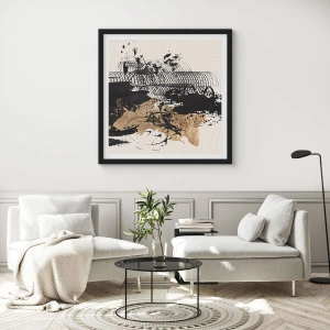 Plagát v čiernom ráme - Abstraktná kompozícia v odtieňoch čiernej a zlatej - 50x70cm - Kompozícia s vášňou - Moderná nástenná dekorácia do obývacej izby a spálne ARTTOR