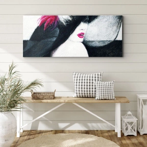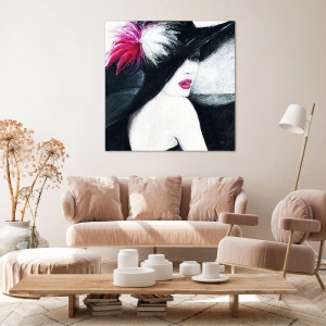 - Plátno s obrazom elegantnej ženy v pernatom klobúku. Tento štýlový portrét v odtieňoch čiernej a ružovej dodáva interiéru nádych noblesy a elegancie a umocňuje jeho charakter.